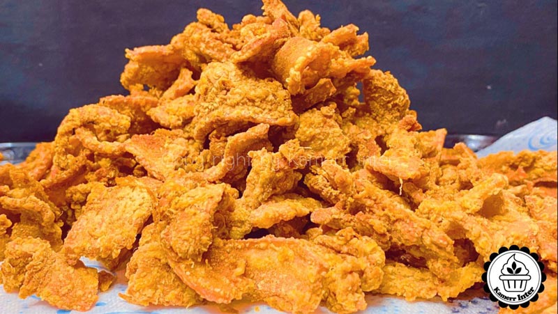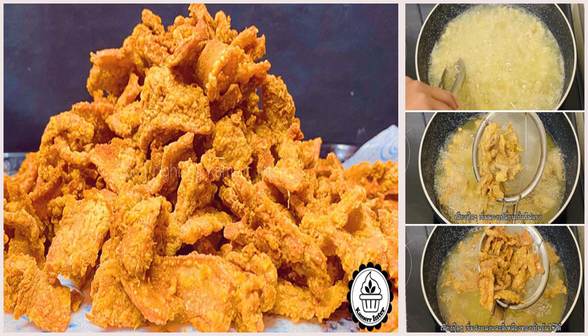 ► การทอดในตอนแรกใช้เป็นไฟกลาง ใส่แป้งลงไปในน้ำมันจะช่วยกันไม่ให้หมูติดกันตอนทอด และหมูไม่ติดกระทะ แบ่งใส่หมูลงไปทอด และแผ่ ๆ ออกไม่ให้ติดกัน