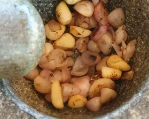 3.ตำหอมแดงและกระเทียม ให้แหลกพอประมาณ และใส่พริกป่นลงไปตำต่อ
