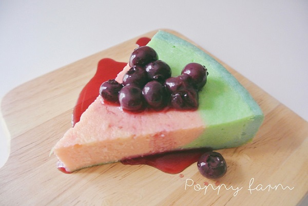 • เสร็จแล้ว เราทำสามสี ได้แก่ สีชมพู สีเขียว และสีฟ้า แต่สีฟ้ามันอ่อนไปเนอะ ออกมาเลยเหมือนแตงโม