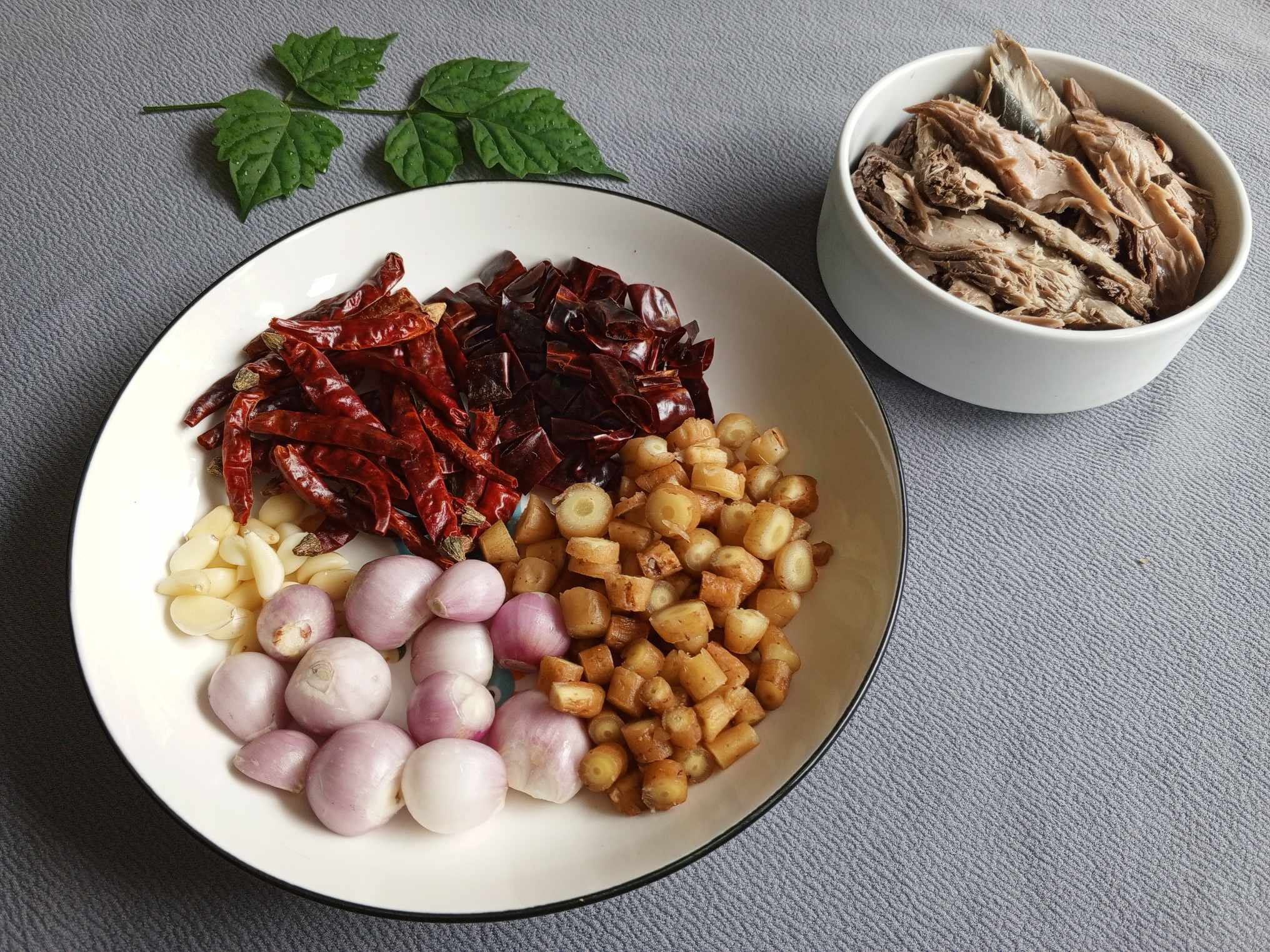 พริกจินดาแห้ง พริกชี้ฟ้าแห้ง หอมแดง กระชาย กระเทียม และเนื้อปลา