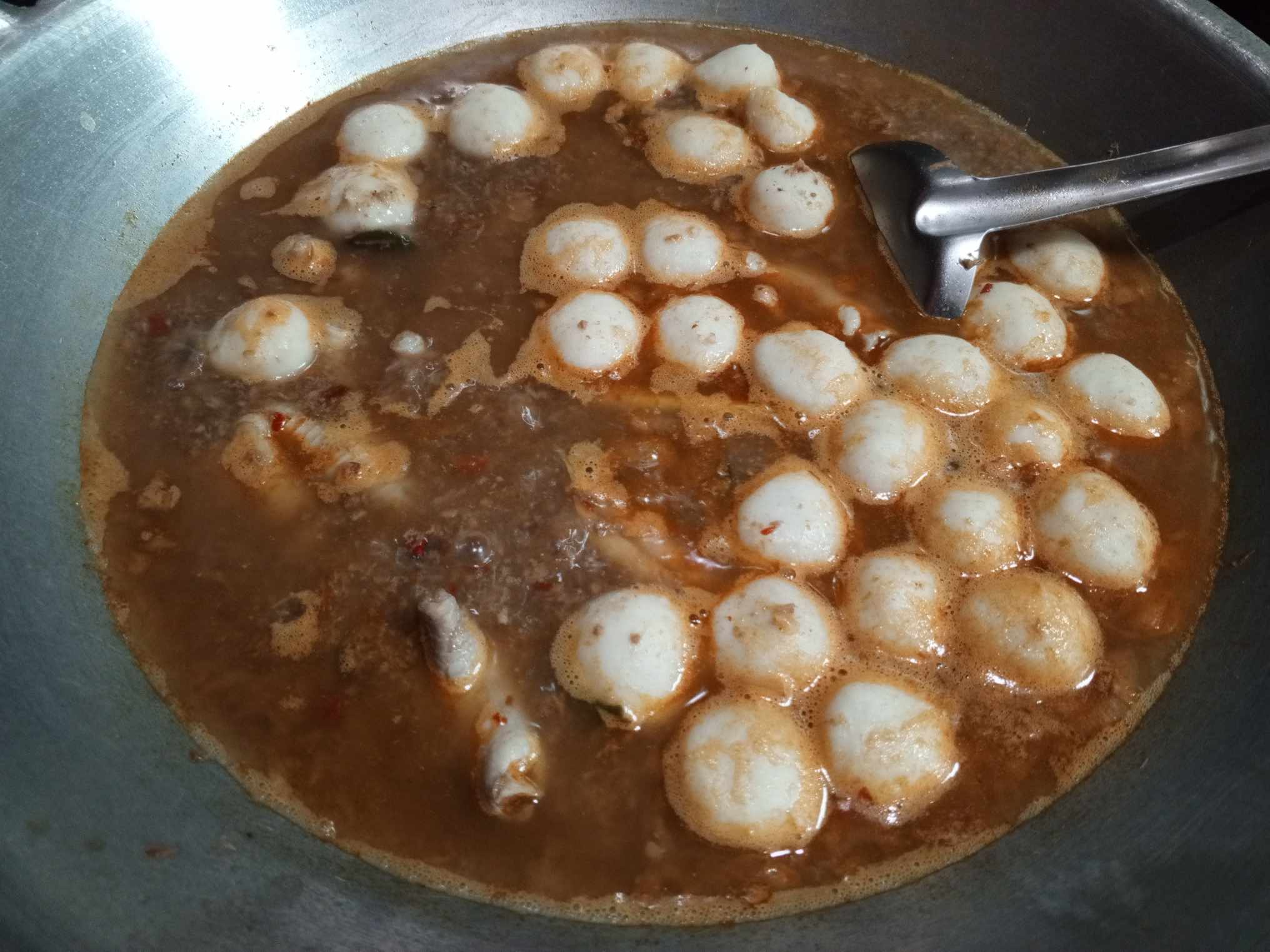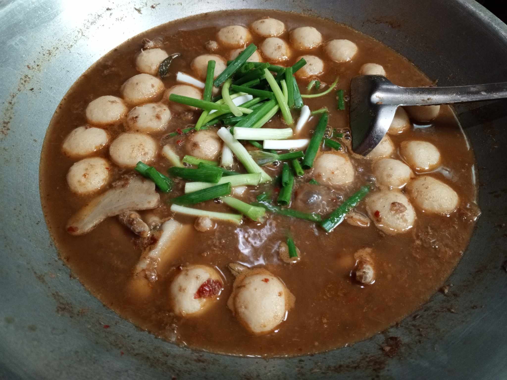 เมื่อน้ำเดือดแล้ว ใส่ตีนไก่และลูกชิ้นปลา