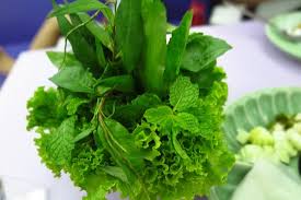 • ผักสดสำหรับกินแกล้ม เช่น ผักแพรว, ใบสะระแหน่, ใบโหระพา, ผักกาดหอม