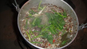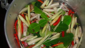 2. ต้มน้ำเปล่าพอเดือด ใส่เครื่องที่โขลก ข่า ใบมะกรูด ลงต้มพอหอม