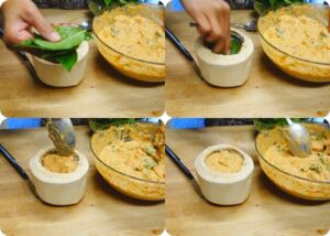 แล้วแต่ชอบเลยค่ะ) นำผักวางลงก้นลูกมะพร้าว แล้วก็ใส่ตัวห่อหมกทะเลลงไปให้เต็มลูกค่ะ เดี๋ยวเราจะเอาไปนึ่ง