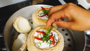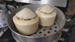 6. เสร็จแล้วเราก็เอาไปใส่ชุดนึ่ง หรือซึ้งนั่นเอง รอให้น้ำเดือดพล่านก่อนนะคะ แล้วเอาลูกมะพร้าวใส่ลงในซึ้ง นำขึ้นนึ่งประมาณ 25-30 นาที