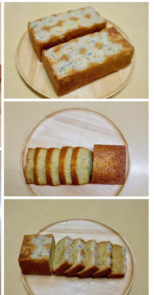 5. ตักใส่พิมพ์ก้อนขนาด 7 X3X2 1/2 นิ้ว จำนวน 4 พิมพ์ ที่ทาไขมันรองกระดาษและทาทับอีกครั้งที่หั่นกล้วยเป็นแว่นเรียงด้านล่างไว้ก่อนแล้ว ประมาณ 3/4 ของพิมพ์ หรือตัดกล้วยตามยาวครึ่งลูก วางลงหน้าเเค้ก แต่วิธีนี้เมื่ออบสุกกล้วยจะจมอยู่ตรงกกลางเค้ก