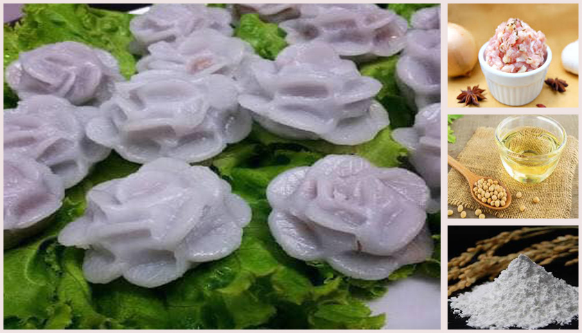ปั้นแป้งเป็นก้อนกลม แล้วแผ่แป้งออกให้เป็นแผ่น ตรงกลางเป็นแอ่ง ตักไส้ใส่หุ้มแป้งปิดให้สนิท ปั้นแป้งให้เป็นรูปครึ่งวงกลม ใช้แหนบจับจีบเป็นรูปกลีบดอกไม้ โดยเริ่มจากกึ่งกลางลูก 3 กลีบ ชั้นที่ 2 กลีบให้สับระหว่างกับชั้นแรกจำนวน 5 กลีบ ชั้นที่ 3 ก็ให้กลีบสับระหว่างชั้นที่ 2 เป็น 7 กลีบ