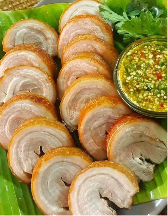 5 น้ำหมูสามชั้นที่ตากแดดแล้วมาทอดให้หนังกรอบ พอหมูสุกเหลืองแล้วนำขึ้นมา หั่นให้เป็นแว่นๆ เหมือนหมูชาชู