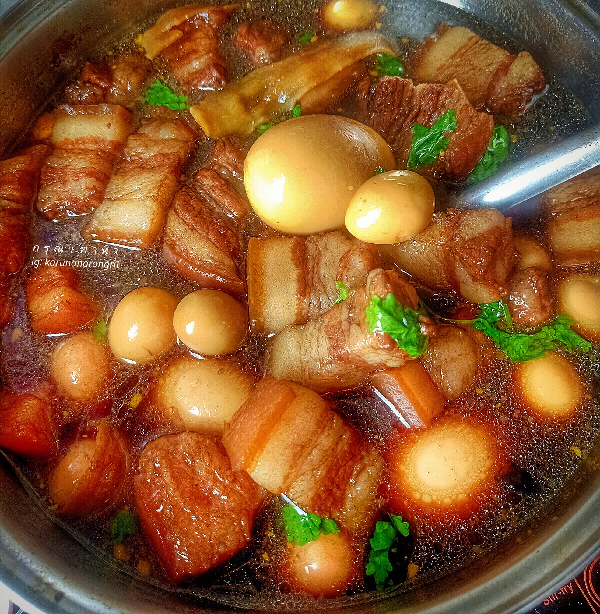 3.ใส่หมูสามชั้นหั่นลงไปต้ม พร้อมกับไข่ต้ม