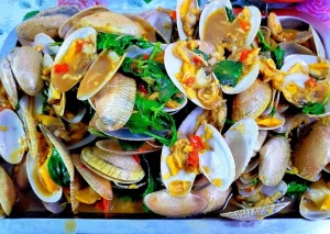 3.ปรุงรสด้วยเครื่องปรุงต่างๆ กินรสไหนปรุงได้ตามชอบ แล้วผัดต่อจนหอยสุก แล้วน้ำงวดลงนิดนึง จากนั้นก็ใส่ใบโหระพาลงไป คนให้เข้ากัน