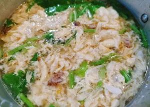 2.ตีไข่ในถ้วยจนเข้ากัน โรยไข่ใส่หม้อโดยยกมือให้สูงจากหม้อหน่อย โรยวนๆ ทั่วๆ หม้อเร็วๆ ปิดไฟทันที