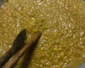 2.พอกวนสีเริ่มเข้มขึ้นให้ใส่กะทิ ใส่น้ำตาลค่อยๆใส่ ค่อยๆ ชิมไป น้ำตาลขึ้นอยู่กับความเปรี้ยวของมะม่วงแต่ละบ้านนะคะ