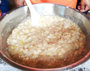 4.เทกล้วยบดลงไป ใช้พายตะล่อมให้กล้วยบดกับแป้งเข้ากันดี