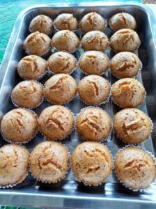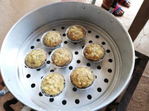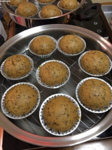 7.นำขนมไปนึ่ง ใช้เวลา 15 นาที หากเป็นพิ ม พ์เล็ก ก็ใช้เวลา 12 นาทีก็พอ หรือสังเกตสีขนมหากเป็นสีน้ำตาลก็ถือว่าสุกแล้ว