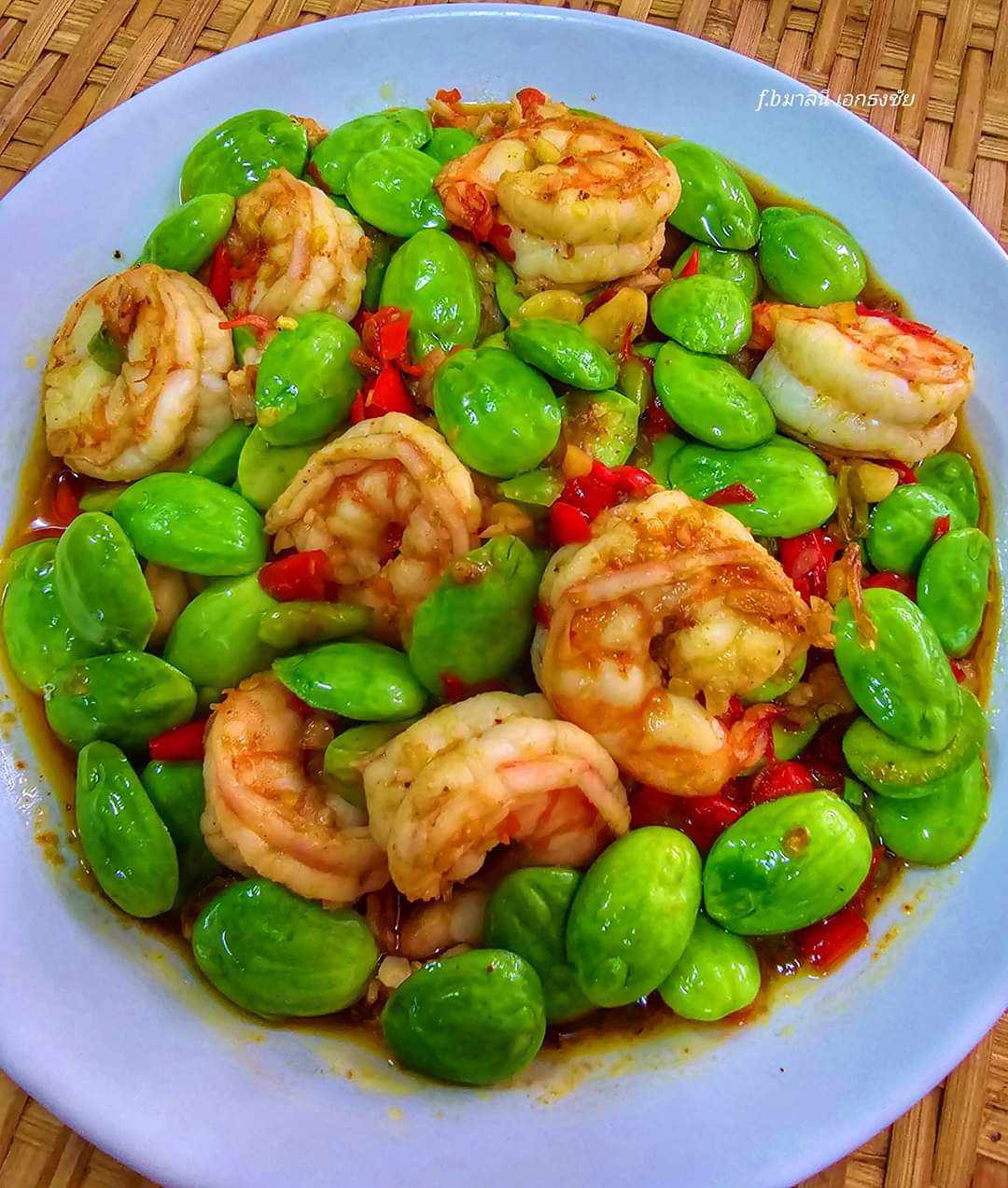 - ใส่กุ้งสดลงไปผัดจนสุกแล้วใส่สะตอลงไปผัดให้พอเข้ากัน ปิดไฟ ตักใส่จาน พร้อมเสิร์ฟ