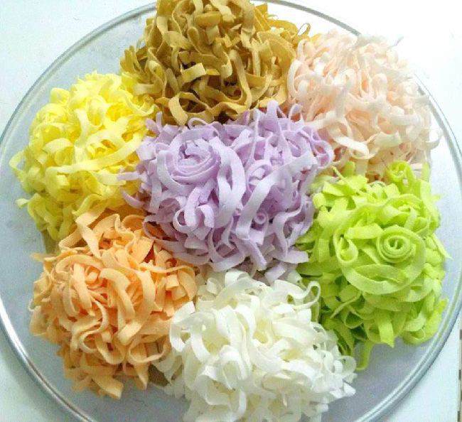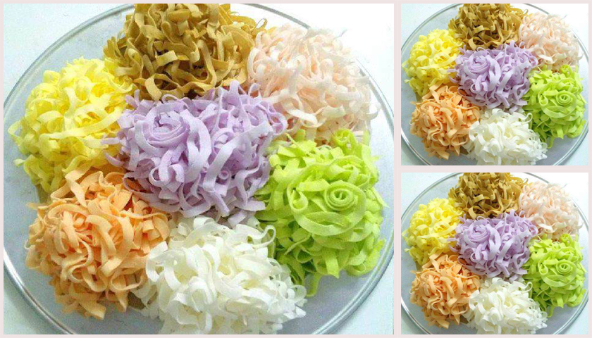 - จากนั้นมะพร้าวที่ผัดเสร็จแล้วมาแบ่งใส่ภาชนะที่เตรียมไว้ 3 ส่วน จากนั้นใส่น้ำอัญชัญ น้ำใบเตย และน้ำกระเจี๊ยบลงไปผัดจนในแต่ละส่วนที่แบ่งไว้กระทั่งสีกระจายเข้ากันเส้นมะพร้าว เสร็จแล้วผัดให้เข้ากันอีกรอบ