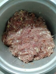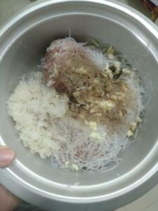 -หมูบ ด วุ้นเส้นตั ดสั้นๆ กระเที ย ม พริกไทยข้าวเหนียว และเครื่องปรุงทุกอย่ างผสมกัน
