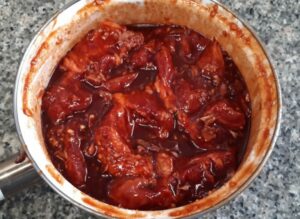 แล้วมาหมักเข้ากับเ นื้ อ ห มูที่เราได้หั่ น เอาไว้ก่อนหน้านี้ คนให้เข้ากันให้ตัวน้ำซอสซึ มเข้า เ นื้ อ