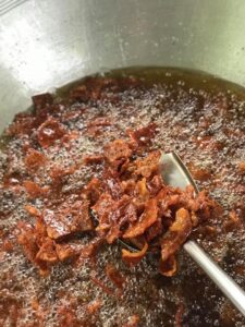 -ตั้งกระทะใส่น้ำมันลงไปพอประมาณใช้ไ ฟ อ่อนๆ เมื่อน้ำมันเริ่มมีความเ ดื อ ดเริ่มมีความร้ อ นให้ใส่ลงไปทอดได้เลย