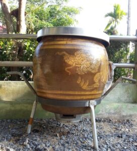 -นำไก่เกี่ยวกับตะข อ เ ก าะที่ป ากโอ่ง ให้ตัวไก่จะหย่อนลงไปในโอ่ง แล้วปิดฝ าโอ่ง