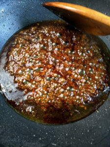 6.ลองชิมดูพอได้ที่ก็เติมน้ำละลายแป้งมันลงไปเล็กน้อยแล้วผัดไปเรื่อยๆจนน้ำซอสเริ่มข้น