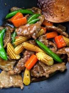 7.เร่งไฟเป็นไฟแรง แล้วใส่เนื้อหมักกับผักที่เตรียมไว้ลงไปผักเร็วๆให้เข้ากันประมาณ 1 นาที ก็เป็นอันเสร็จ