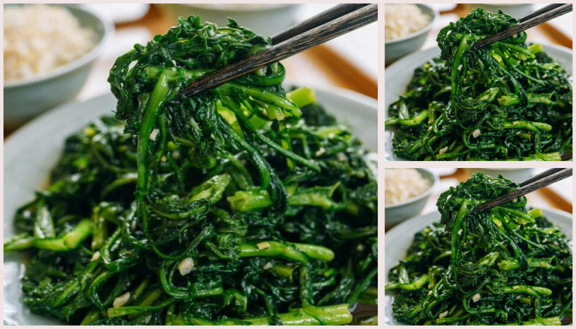 1.ล้างปวยเล้งให้สะอาด ตัดรากทิ้ง ต้มในน้ำเดือดที่ใส่เกลือไว้ 3 นาที