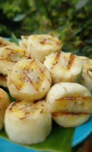2.หั่นกล้วยเป็นท่อนตามขวางหนาประมาณ 1.5 cm. นำไปปิ้งให้เหลืองสวย หรือปิ้งทั้งลูกตามชอบ