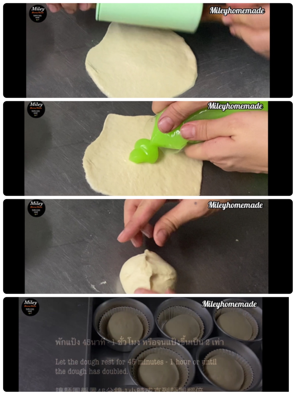 – กลิ้งเป็นแผ่น ใส่ไส้สังขยา และห่อปิดตะเข็บให้เรียบร้อย