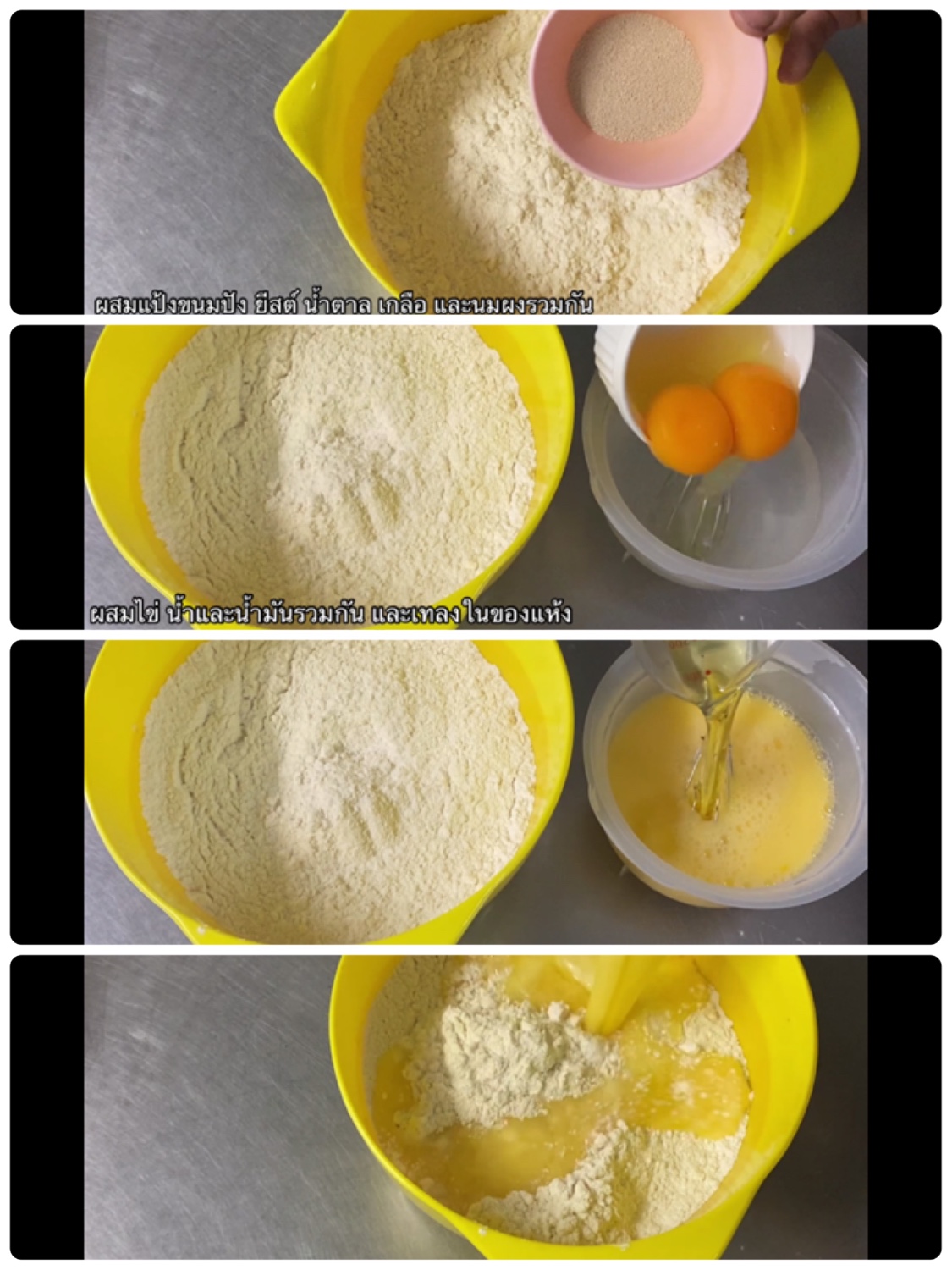 – ผสมแป้งขนมปัง น้ำตาล เกลือ ยีสต์ และนมผง รวมกัน