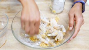 • ก่อนนำไปลงทอดก็จัดการใส่แป้งทอดกรอบลงไปคลุกให้พอเคลือบขากบ ไม่ต้องหนามากนะคะ