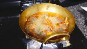 • ตั้งกระทะอะไรก็ได้ ไม่จำเป็นต้องกระทะทองเหลืองนะคะ เปิดไฟอ่อนถึงกลาง อย่าให้ร้อนจัด ค่อย ๆ ใส่ขากบลงทอด