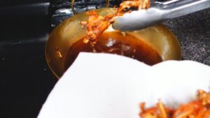 • พอเหลืองกรอบได้ที่ก็ตักขึ้นพักบนกระดาษซับมัน