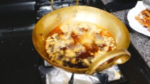 • จากนั้นก็เปิดไฟแรงจนน้ำมันร้อนจัดอีกรอบ