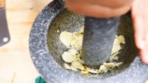 • ตำกระเทียมกับรากผักชีให้พอหยาบค่ะ