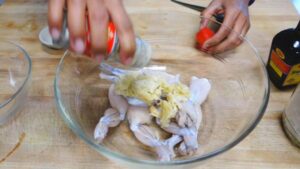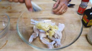 ขากบที่ล้างสะอาดแล้วมาใส่อ่างผสม นำกระเทียมกับรากผักชีตำใส่ลงไป