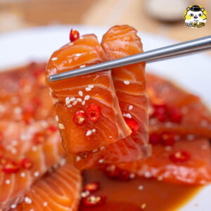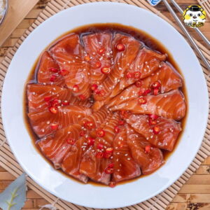 6. เมื่อครบเวลา นำแซลมอนเรียงใส่จานตามด้วยน้ำดองเล็กน้อย และโรยหน้าด้วยพริกแดงซอย และงาขาวคั่ว