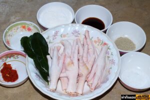 1.ล้างตีนไก่และตัดเล็บให้สะอาดเรียบร้อย