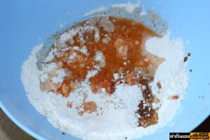 2.ผสมแป้งชุบทอดโดยนำเอา แป้งข้าวโพด พริกแกงเผ็ด พริกไทยป่น น้ำตาลทราย เกลือ น้ำเย็นจัด มาผสมกันและตีให้เข้ากัน