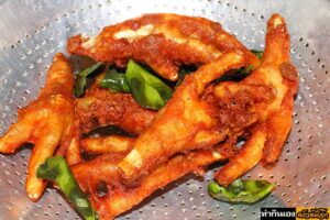 5.ทอดใบมะกรูดจนกรอบโรยบนตีนไก่
