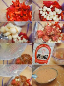 • ใส่พริกลงในโถปั่น ตามด้วยกระเทียม กระเทียมดอง เต้าหู้ยี้ เต้าเจี้ยว น้ำกระเทียมดอง น้ำส้มสายชู และน้ำเปล่า ปั่นจนส่วนผสมทั้งหมดละเอียด จากนั้นเทส่วนผสมใส่ลงในหม้อเคี่ยวจนสุก