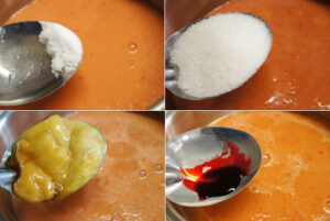 • เติมเกลือป่น (ใช้ประมาณนี้เพราะเต้าหู้ยี้และต้าเจี้ยวเค็มอยู่แล้ว) น้ำตาลทราย น้ำตาลปี๊บ (หากชอบหวานค่อยเติมภายหลังได้) และสีผสมอาหารสีแดงเล็กน้อย เคี่ยวจนเริ่มเดือด