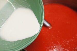 • ใส่แป้งท้าวผสมน้ำลงไป รีบ ๆ คนผสมให้เข้ากัน