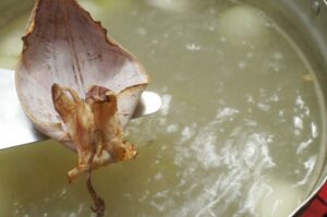 • ต้มน้ำซุปกระดูกหมู ใส่เกลือ น้ำตาลกรวด รากผักชี พริกไทยเม็ดทุบ กระเทียมทุบ หอมใหญ่ ซีอิ๊วขาว หัวไชเท้า และปลาหมึกแห้งย่างไฟ ต้มจนเดือด เตรียมไว้