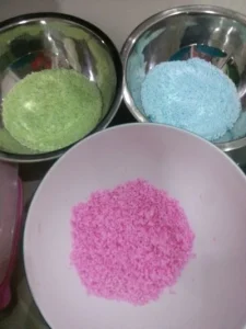 1.นำสาคูสีขาว มาแบ่ง ในที่นี้ ทำ 3 สี แบ่ง 3 ส่วน นำน้ำผสมสี ( 3 สี) ค่อยๆเทใส่ ในเม็ดสาคู ที่แบ่งไว้ ทีละสี ใส่แค่พอดีกับเม็ดสาคู เดี๋ยวเม็ดสาคู จะค่อยๆดูดสี และไปพองเอง