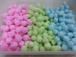 2.นำเม็ดสาคู ที่ผสมสีแล้ว มาปั้นเป็นเม็ด เล็กๆ ไม่ต้องใหญ่มาก เพราะตอนสุกแล้ว เม็ดจะขยายใหญ่ขึ้นมาอีก