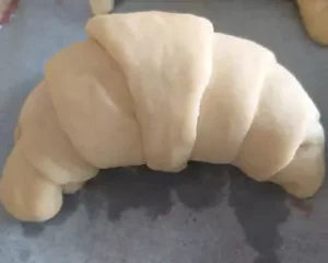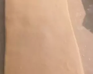7.คลึงแป้งให้เป็นสี่เหลี่ยมผืนผ้าหนาราว5มิลแล้วตัดให้เป็นทรงสามเหลี่ยมความกว้างความสูงตามชอบและขึ้นรูปครัวซองค์แล้วนำไปวางใน