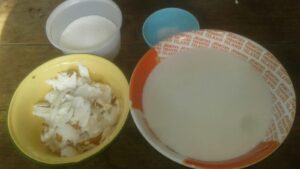 8.เตรียมน้ำเปล่มา1 ถ้วยและช้อน2คันเพื่อตักแป้งใส่ในถ้วยกะทิก่อนตักแป้งเอาช้อนจุ่มน้ำก่อนค่ะเพื่อแป้งจะได้ออกง่ายขึ้นเพราะแป้งมันเค้ามีความเหนียวมากๆ