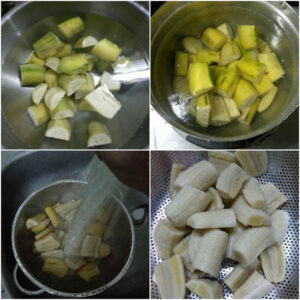 4. ใส่น้ำเปล่าลงในหม้อ ตามด้วยเกลือเล็กน้อย นำขึ้นตั้งไฟ รอจนน้ำเดือด นำกล้วยที่หั่นไว้ลงต้มในน้ำเดือด ๆ ประมาณ 30 นาที
