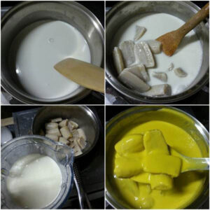 8. เมื่อกะทิเดือด นำกล้วยลงไปต้มในน้ำกะทิประมาณ 15 นาที สีกล้วยจะเปลี่ยนเป็นขาว ๆ ใส ๆ ขึ้นมา
